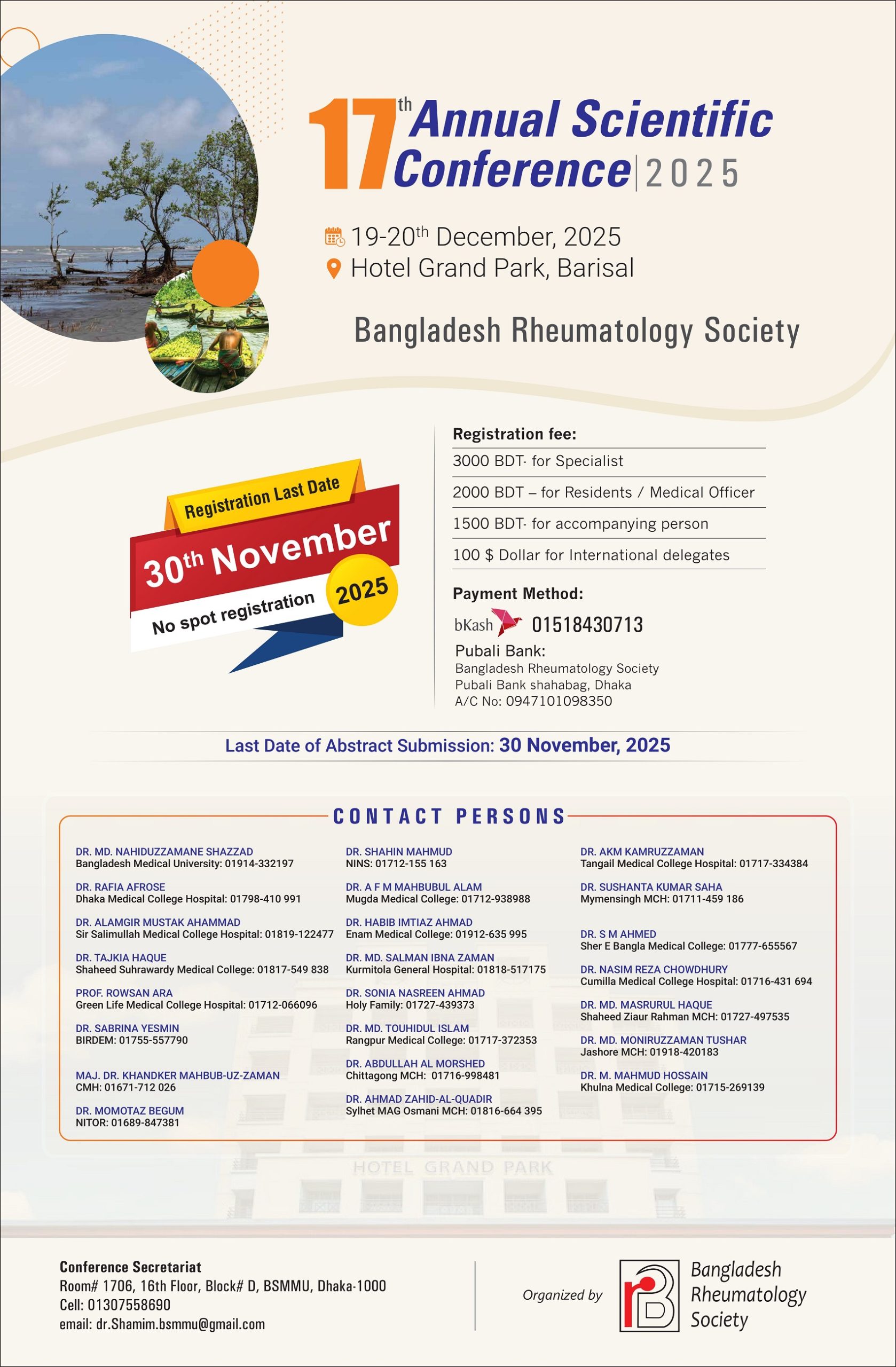 The Bangladesh Rheumatology Society was established in 28th April 1997. The Physician and Surgeons of Bangladesh who are engaged in treating different Rheumatic conditions were the founder of this society. This society arrange biannually National conference on Rheumatology with the participation of National and International speakers, observes different International Rheumatic days, arrange seminar and symposium to ensure evidence based practice. The first international conference was held in 1998. The renowned Rheumatologist of home and abroad participate in the international conferences. BRS is one of the member of APLAR and maintain a close relationship with other international rheumatic societies.